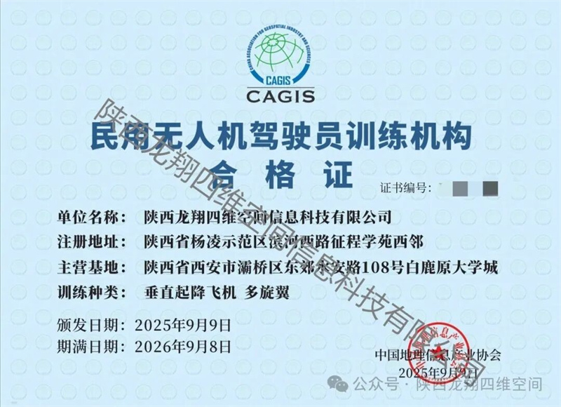 days 09 /12 熱烈祝賀陜西龍翔四維空間信息科技有限公司成功取得民用無人機(jī)駕駛員訓(xùn)練機(jī)構(gòu)合格證! 恭喜陜西龍翔四維空間信息科技有限公司斬獲民用無人機(jī)駕駛員訓(xùn)練機(jī)構(gòu)合格證!這是專業(yè)實(shí)力的硬核認(rèn)證,也是信任的基石,愿以此為起……